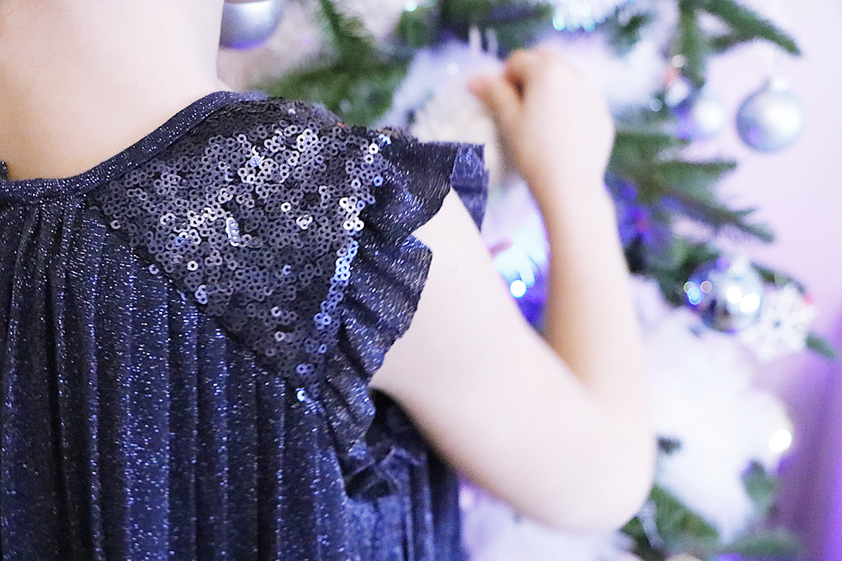 Emma a opté pour une tenue bleu nuit pailleté. La pièce principale, une robe, existe également en dorée. J’adore le tissus plissé qui lui donne beaucoup d’originalité. Elle est rehaussée, aux épaules de sequins assortis et de volants en tulle.