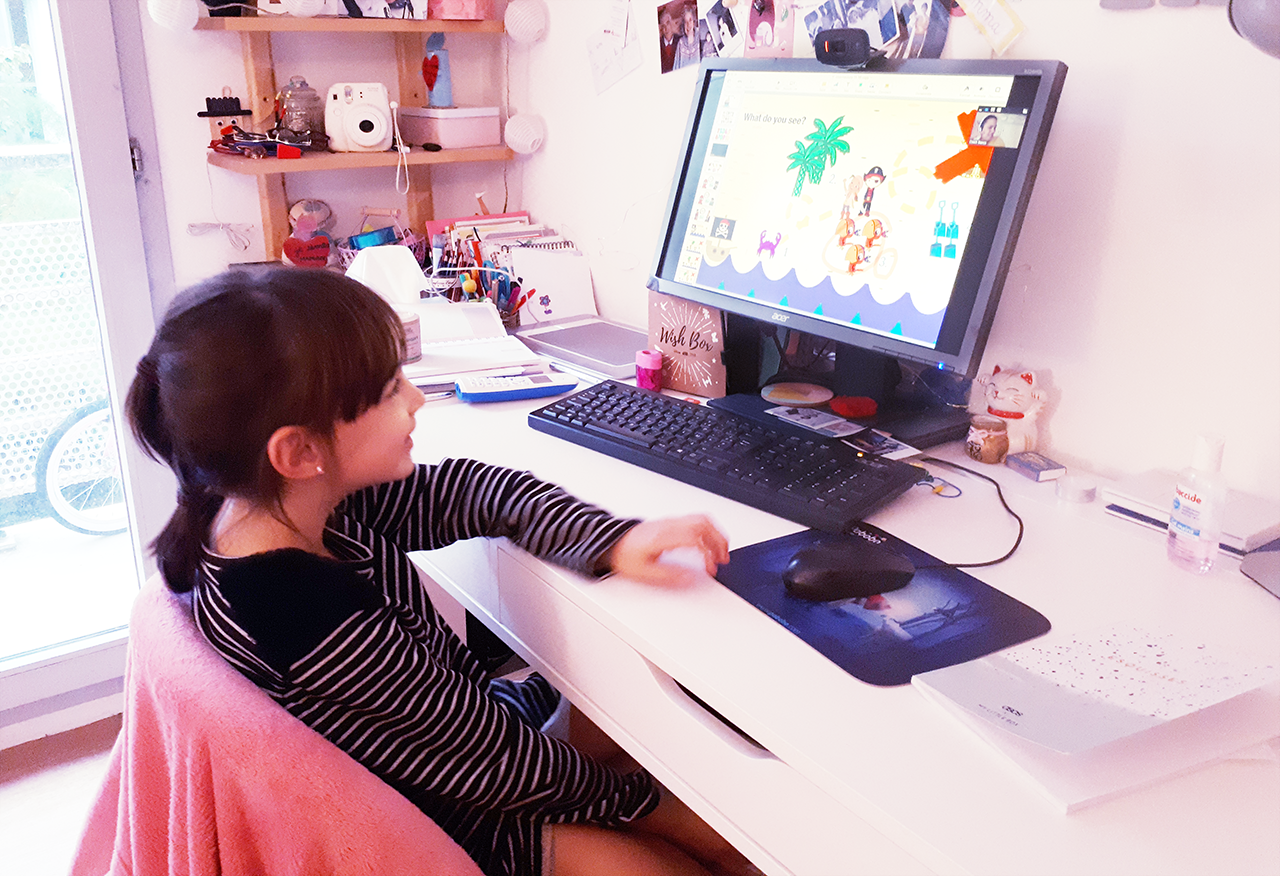 La séance se passe via webcam interposées. L’enfant travaille ainsi à son rythme, en s’amusant… face à un enseignant diplômé de langue maternelle ayant une expérience avérée auprès des enfants.