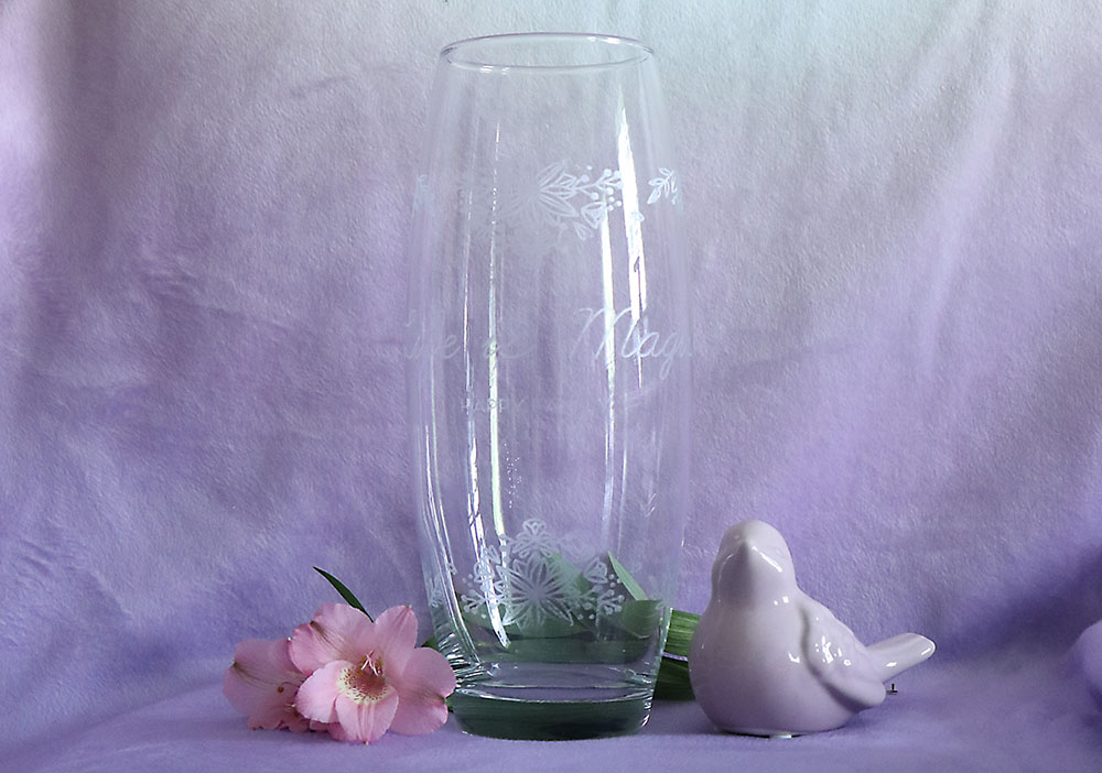 J’aime penser, aussi, offrir utile et pas inutile. Un vase, par exemple, fait partie des objets qui me semble être le plus adapté à la confection d’un cadeau personnalisé. Un vase, c’est le contenant du bonheur, du plaisir offert sous la forme de jolies fleurs… Un vase c’est décoratif et on peut le faire personnaliser de jolies gravures. A travers elle, on peut rappeler les choses essentielles de la vie ! J’ai fait personnaliser le mien d’un joli « Life is magic » pour ne jamais oublier la magie de nos vies… Et j’ai choisi d’intégrer une seconde ligne disant « Happy Family », comme un talisman…