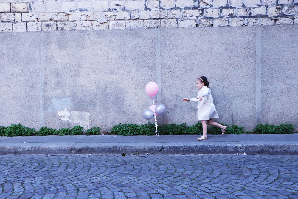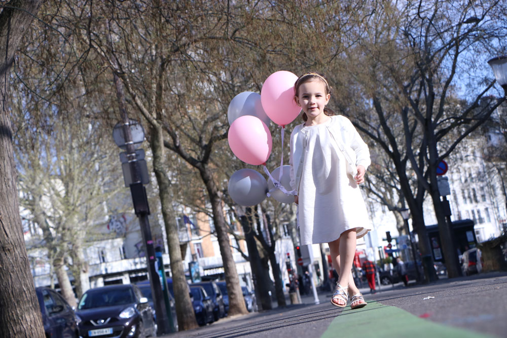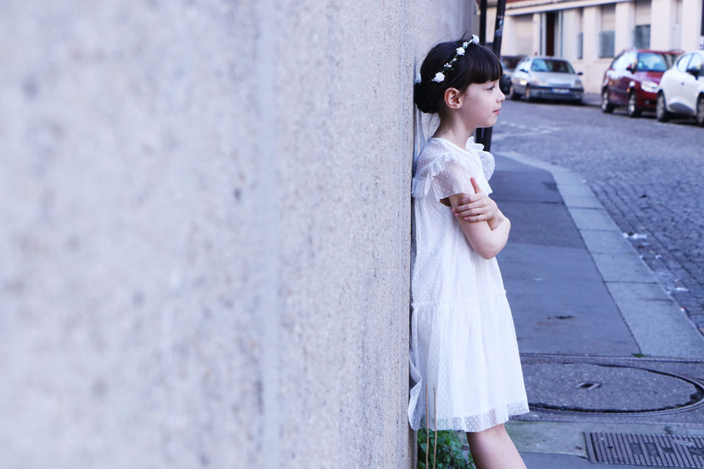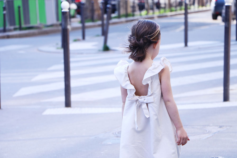 Léna porte ici une robe écrue en toile irisée. Elle est doublée pour plus de confort. Je craque totalement pour le décolleté du dos. Volanté et souligné d’un adorable noeud, il est, je crois, ce qui donne tout le charme à cette jolie robe !