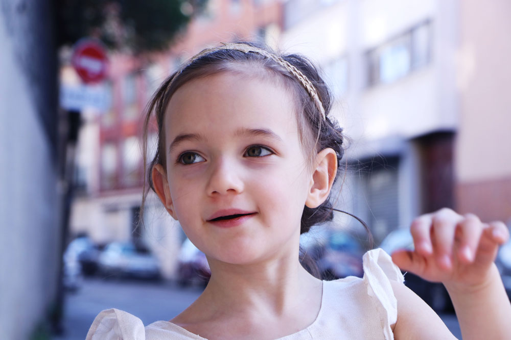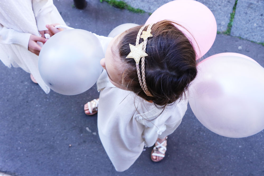 J’ai voulu coiffer Léna d’une sorte de chignon large, maintenu par des pinces et le joli headband étoilé. Mais ses cheveux sont tellement fins que j’ai fini par obtenir une sorte de chignon coiffé-décoiffé, d’ailleurs plus décoiffé que coiffé.