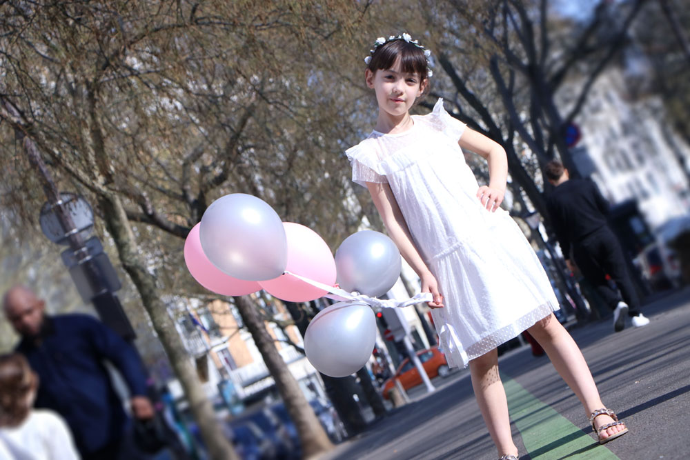 Emma a choisi une robe blanche. Une petite robe toute de voile façon plumetis. Doublée d’un voile de coton ton sur ton, elle n’est, ainsi, pas transparente. Ses empiècements volantés donnent du charme à cette jolie robe.