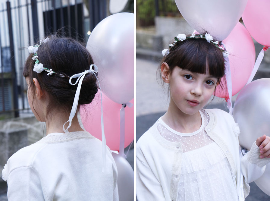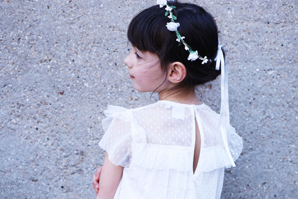 Pour l’accessoiriser, nous avons choisi une couronne de fleurs blanches qui est tout simplement sublime. Je l’ai nouée sur sa tête sur un chignon bas tressé. Les rubans qui descendent dans le dos donnent un aspect vraiment charmant à la tenue.