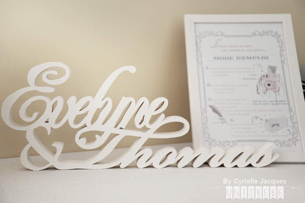 Pour parfaire ce petit espace et nous l’approprier davantage, j’avais envie de le décorer avec des grosses lettres en carton ou en bois. Beaucoup utilisent des grandes lettres achetées en magasins de loisirs créatifs. Bien souvent, ils ne mettent que les initiales des mariés. J’avais pensé faire ça… Et puis Art des Zifs (le site dont j’ai parlé un peu plus haut) m’a justement proposé de tester un nouveau service qu’il mettait en place : des lettres décoratives en bois. J’ai tout de suite imaginé nos deux prénoms accolés, fusionnés dans cette matière noble qu’est le bois. J’ai donc demandé la réalisation d’une pièce de bois « Evelyne & Thomas ». Rapidement, j’ai reçu le produit à la maison. Bien protégés dans son colis par deux plaques de contre-plaquée et de plastique à bulles, nos prénoms sont arrivés intacts. J’ai apprécié le détail de la réalisation dans un bois de qualité. La pièce de bois est arrivée brute. J’ai donc décidé de la peindre afin de lui permettre de s’intégrer au thème de notre mariage. Je l’ai simplement peinte en blanc avec une bombe de peinture. Vous la découvrez à présent sur la table de notre coin urne et livre d’or. Aujourd’hui, cet élément a intégré notre chambre. Nos prénoms y ont trouvé naturellement place. Ils apportent, je trouve, de la chaleur à la pièce bien qu’ils aient gardé leur « parure » blanche. J’ai un peu hésité à les installer sur la porte de notre chambre mais l’agencement des lieux ne s’y prêtent pas vraiment. Mais je crois que c’est une belle idée que d’utiliser des prénoms en bois tel que ceux-là sur les portes de chambre des enfants par exemple… C’est vraiment une belle pièce qui peut également constituer un joli cadeau.