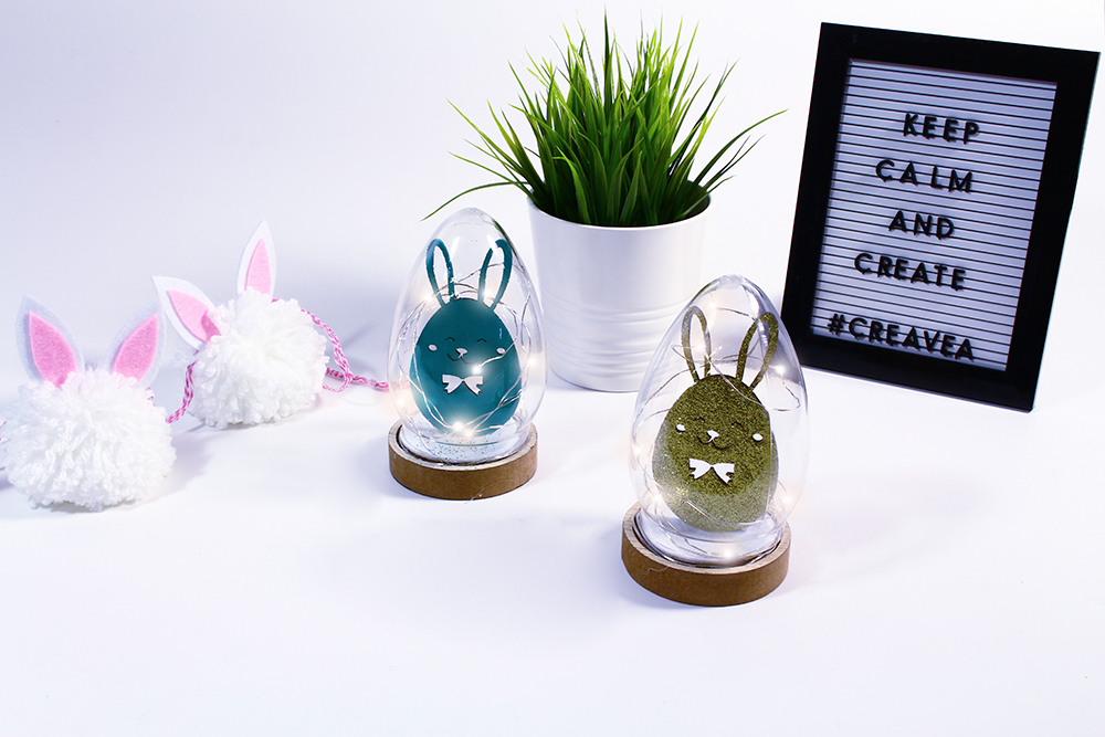 Vous pouvez maintenant coller le lapin oeuf au centre du socle. Il ne reste plus qu’à enrouler la guirlande autour de la création, de replacer la cloche, allumer la guirlande… et admirer !
