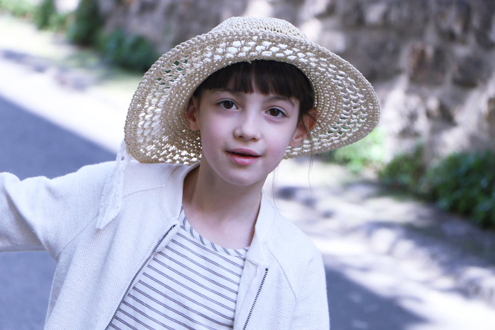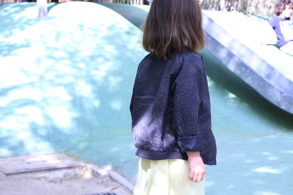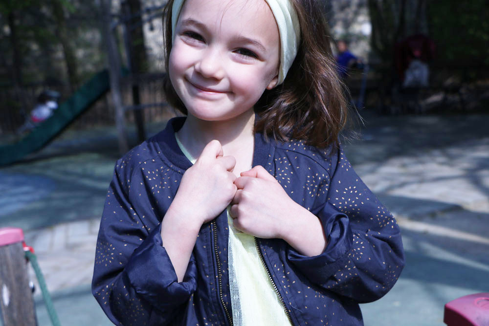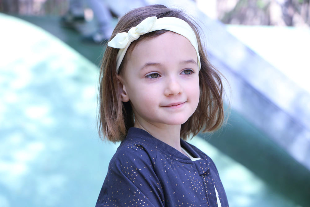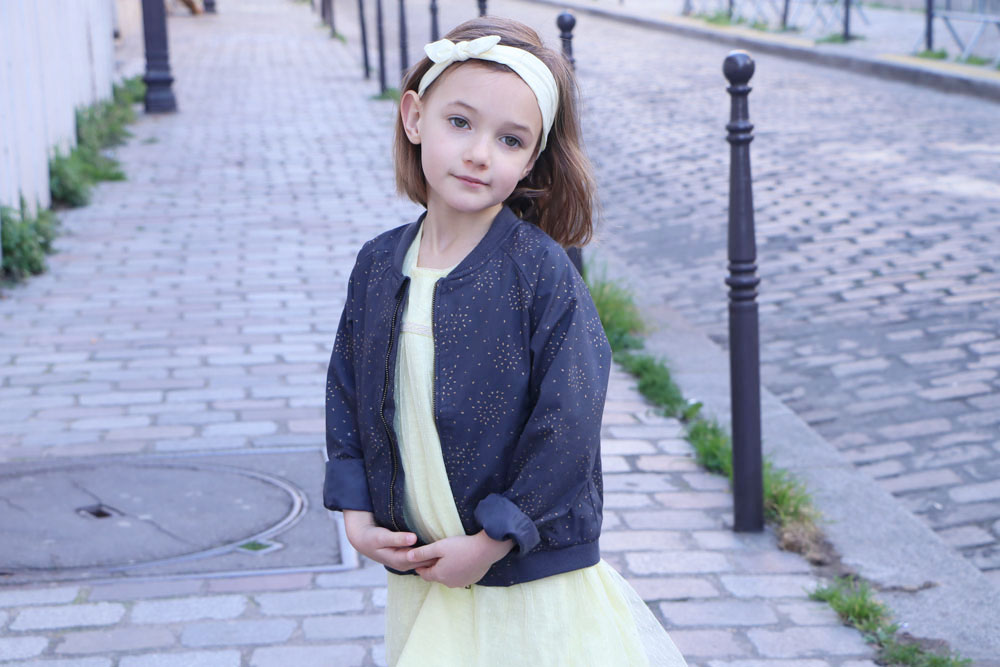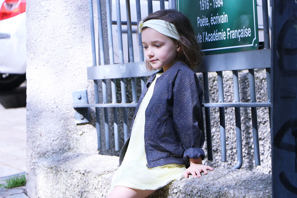 Dans ses cheveux, j’ai glissé un joli bandeau en coton de couleur jaune, assortie ainsi à sa tenue. Le bandeau est vendu avec deux autres exemplaires de coloris différents tout aussi jolis : une rayé doré et un autre avec des motifs floraux dans les teintes noires.