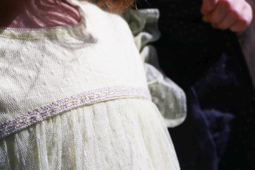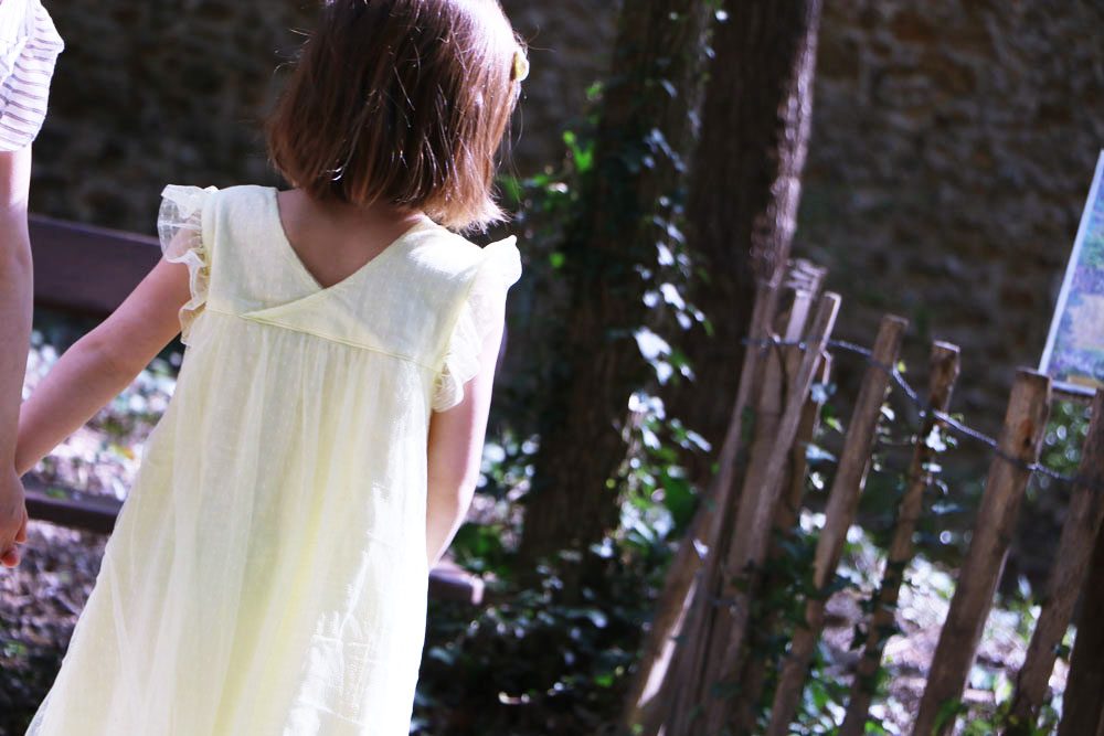 Léna est fan de jaune en ce moment. Il était donc évident de choisir cette petite robe en tulle dont elle est tout de suite tombée amoureuse. Elle est vraiment très jolie et très légère : j’adore sa matière. Fluide, elle est également volantée aux épaules, ce qui en fait une tenue très festive. Je craque pour le mini décolleté en V situé dans son dos.