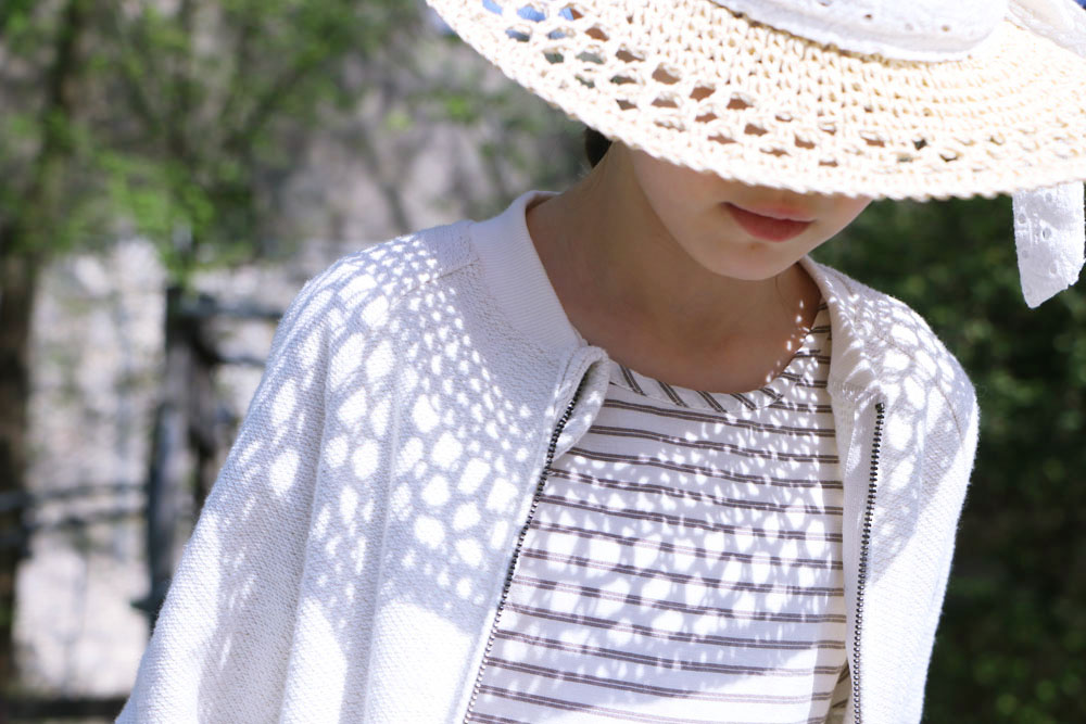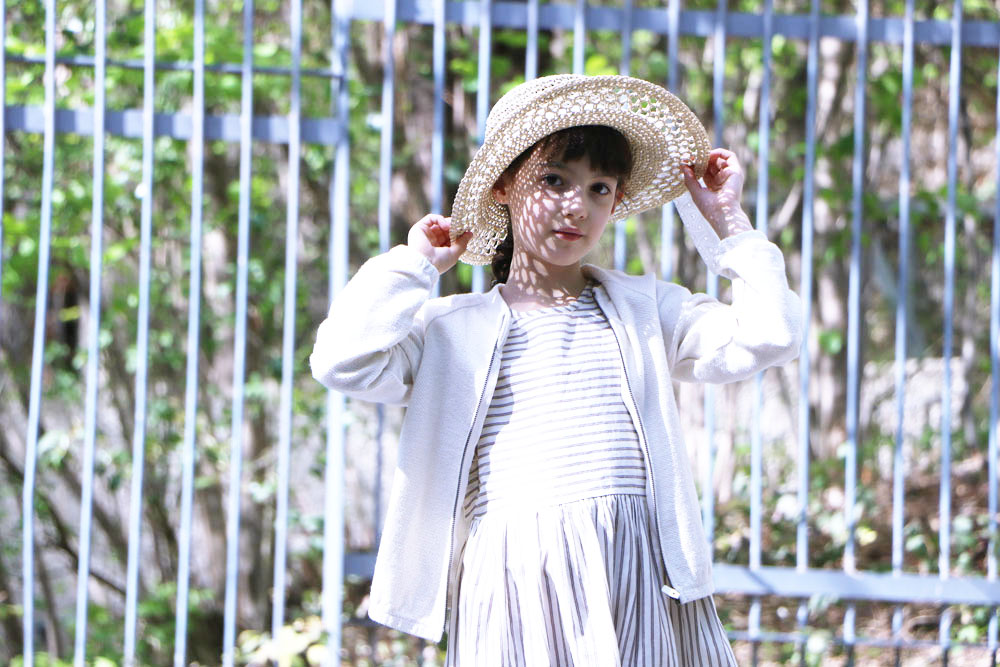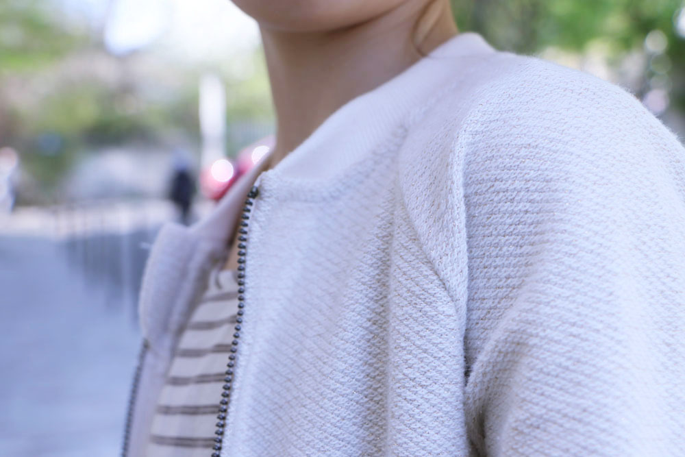 La petite robe à rayure d’Emma, ses fines rayures et son tissu volanté cache, rappelle de jolis modèles classiques… Mais, en réalité, elle cache bien son jeu. Son dos décolleté en fait une tenue aussi classique que moderne. Vous ne trouvez pas ? Associé à son gilet zippé, on casse le côté cérémonie pour en faire une tenue de tous les jours. Focus, d’ailleurs, sur cet adorable gilet qui, avec sa forme Teddy, donne un aspect dynamique et jeune à la tenue.
