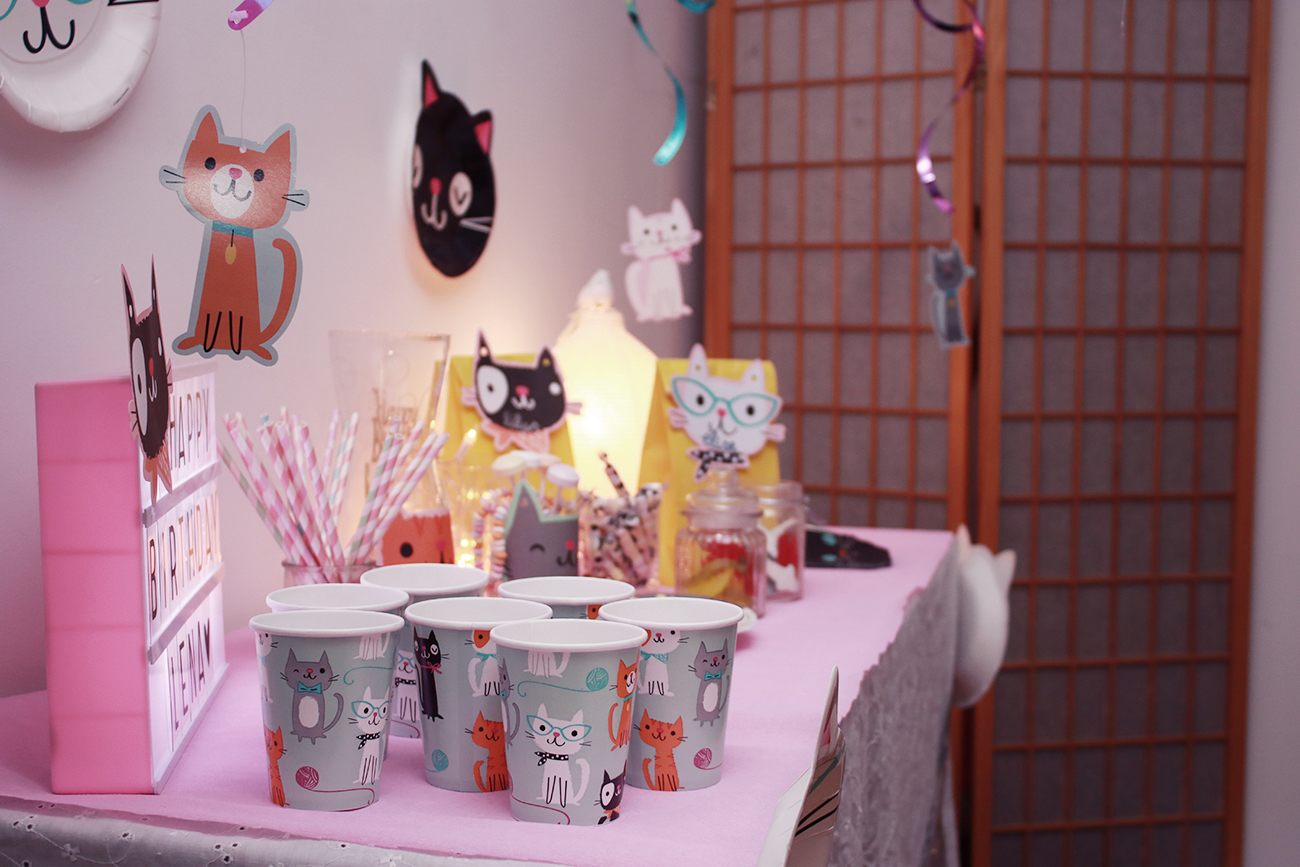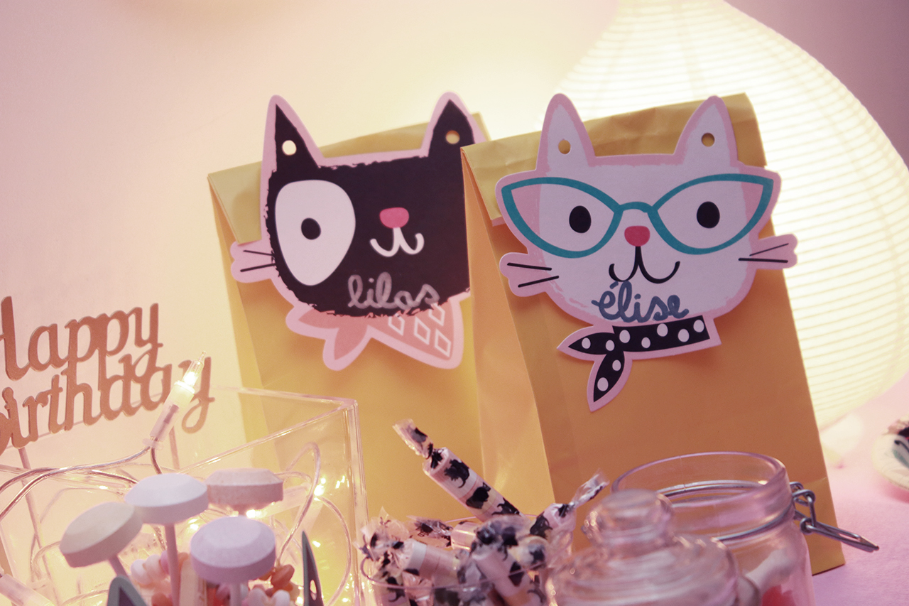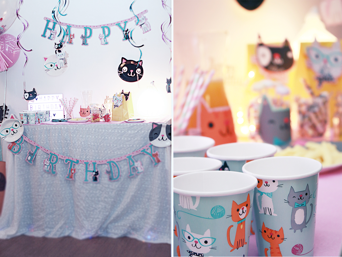 Pour la déco, je me suis fournie chez Mybbshowershop comme à chacun des anniversaires des filles. Du coup, c’était hyper facile parce que le site propose toute une décoration assortie autour de la thématique d’anniversaire du chat. J’ai trouvé des assiettes et verres en carton mais aussi des banderoles HAPPY BIRTHDAY et même des guirlandes à faire tomber du plafond. J’ai adoré déposer sur la table de mignonnes petites serviettes en forme de tête de chat… D’ailleurs, je ne vous cache pas que j’ai pu les ressortir lors d’un apéro entre adultes et elles ont énormément plu !!! Gros succès chez les petites invitées pour les assiettes en forme de tête de chat !