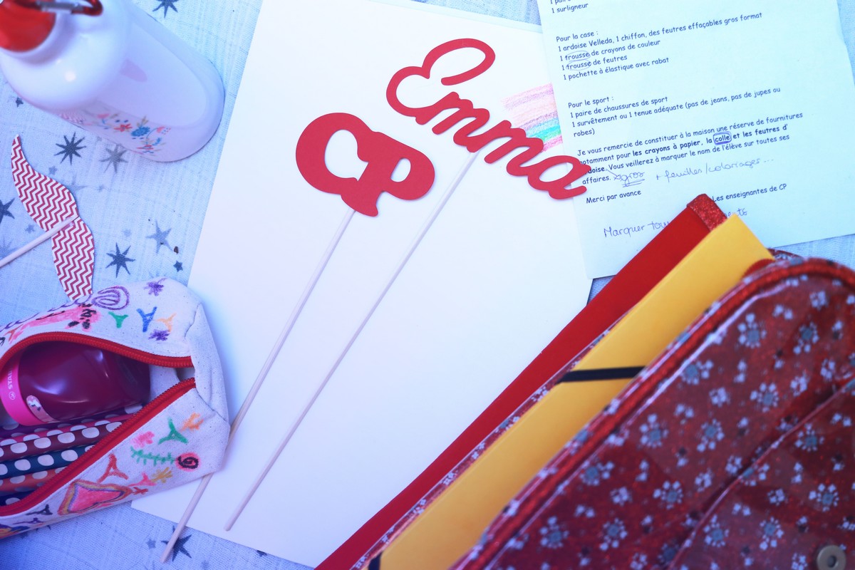 Au moment où j’ai pris les photos, je n’avais pas encore eu le temps de rassembler toutes les petites choses exigées par l’école comme le stock de tubes de colle ou encore l’ardoise blanche ou les feutres Velleda…