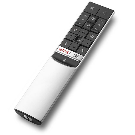 Celle-ci n’est pas fournie avec le téléviseur mais s’avère vraiment très pratique. J’avoue qu’ici on n’utilise quasiment que celle-ci… la télécommande livrée avec le téléviseur est un peu oubliée. L’avantage de la télécommande vocale c’est qu’elle permet de profiter pleinement des fonctions de Google Assistant et donc de piloter la télévision à la voix… mais aussi avec un pointeur… et oui, comme sur un ordinateur. La télécommande se comporte effectivement comme une souris. Bref, voilà qui s’avère très pratique et confortable !