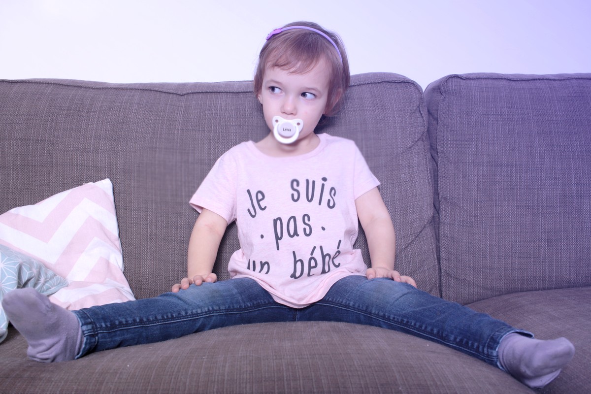 Sauf que, bon, ahem, dans la vraie vie, la vraie de vraie de chez vrai, c’est pas vraiment ça. Notre grande est en fait encore un peu un bébé. Comme je vous le disais dans un précédent article, Léna n’a pas eu le temps d’être un bébé. Du fait qu’elle soit née en fin d’année, on lui a toujours demandé plus d’efforts et surtout de grandir plus vite. Sa soeur, elle, mine de rien, aura toujours eu 9 mois de tranquillité devant elle. Ainsi, Emma a abandonné la tétine durant l’été 2015. Elle avait alors 4 ans et demi et entrait en moyenne section. Léna, elle, vient d’entrer « chez les moyens » comme elle dit… mais elle n’a pas encore 4 ans. Sa tétine la suit toujours.